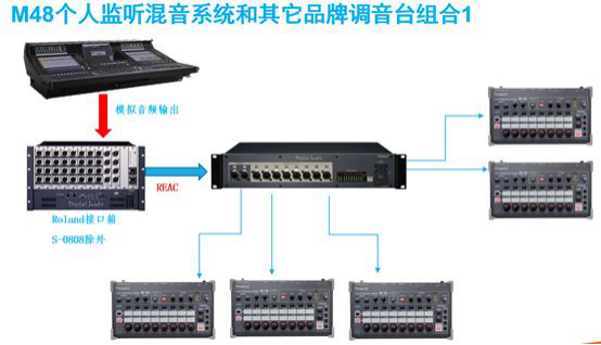 1)采用模模擬方式連接,其它品牌調(diào)音臺模擬信號輸出到1臺Roland任意接口箱(注:S-0808除外),1臺S-4000D電源和信號分配器,8個以下的M48個人混音臺