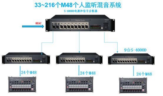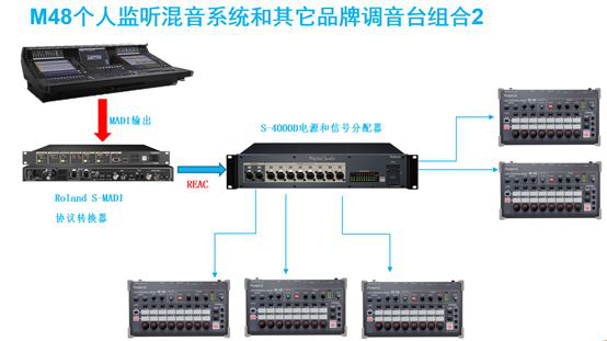 2)采用數(shù)字方式連接,其它品牌調(diào)音臺輸出MADI信號(有的調(diào)音臺可能需要單獨加MADI卡)給S-MADI轉(zhuǎn)換器, 1臺S-4000D電源和信號分配器,8個以下的M48個人混音臺。